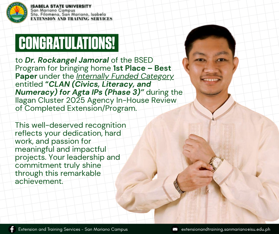 In a remarkable display of dedication and scholarly excellence, Dr. Rockangel Jamoral of the BSED Program has clinched 1st Place – Best Paper under the Internally Funded Category for his work on the “CLAN (Civics, Literacy, and Numeracy) for Agta IPs (Phase 3)” Program. The recognition came during the Ilagan Cluster 2025 Agency In-House Review continue reading : Dr. Rockangel Jamoral Triumphs with Best Paper Award for CLAN Program