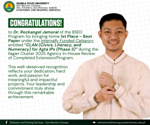 In a remarkable display of dedication and scholarly excellence, Dr. Rockangel Jamoral of the BSED Program has clinched 1st Place – Best Paper under the Internally Funded Category for his work on the “CLAN (Civics, Literacy, and Numeracy) for Agta IPs (Phase 3)” Program. The recognition came during the Ilagan Cluster 2025 Agency In-House Review of Completed Extension/Program, highlighting his innovative approach and unwavering commitment to meaningful educational initiatives.